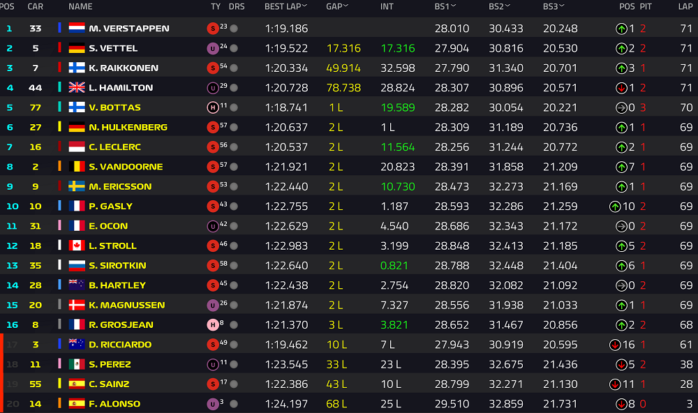 VSC 结束后,比赛恢复正常节奏,维斯塔潘依旧保持领先优势,而汉密尔顿、维特尔和里卡多之间的争夺愈发激烈。三位车手在赛道上你追我赶,每一圈都充满了悬念,他们之间的差距始终保持在极小的范围内,为观众奉献了一场精彩绝伦的速度盛宴。