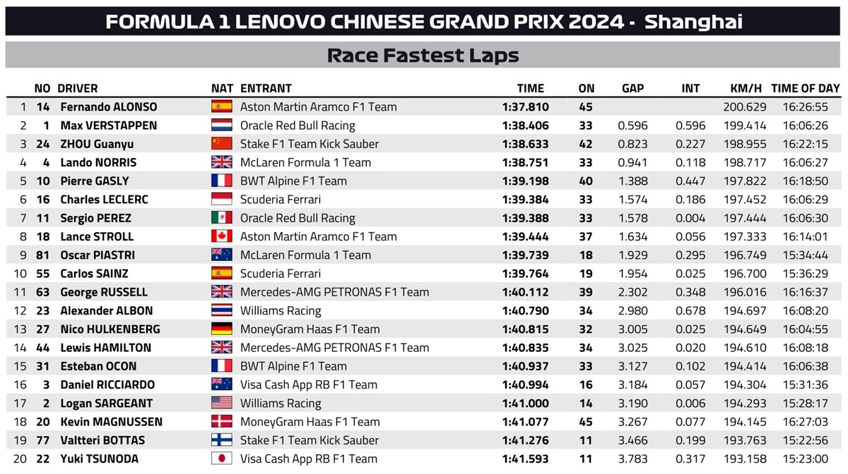 第二名是诺里斯,第三名是佩雷斯,本土车手周冠宇获得第十四名,比赛时天气干燥。