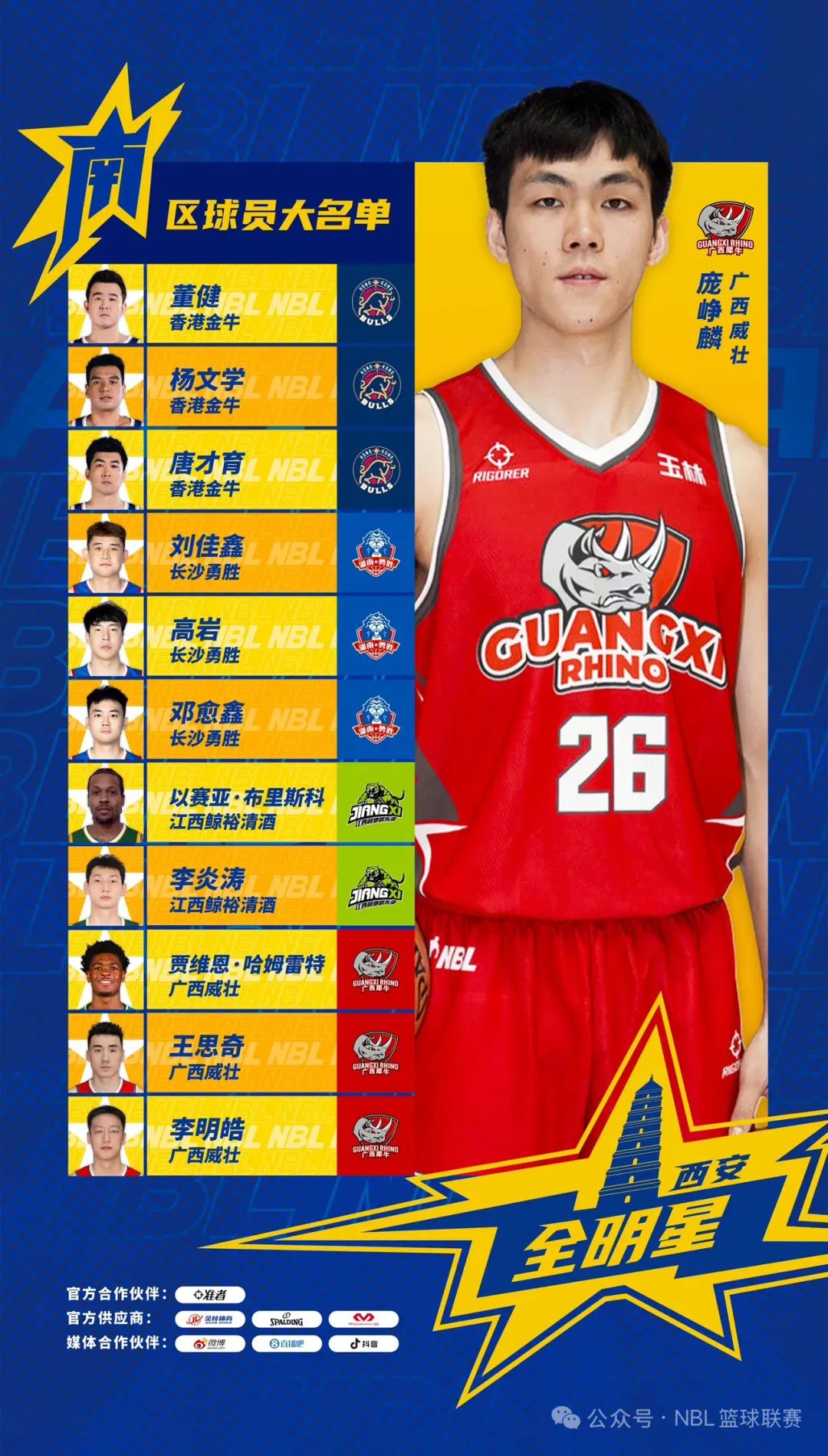 南区阵容由票王庞峥麟领衔,其所在的广西威壮共有4人入选,成为最大赢家。除庞峥麟外,锋线悍将李明皓、外援哈姆雷特及射手王思奇均跻身名单。香港金牛队同样贡献3名球员,包括后场核心董健、内线支柱杨文学以及经验丰富的唐才育。长沙勇胜队刘佳鑫、高岩、邓愈鑫凭借赛季稳定表现入选,江西鲸裕清酒则派出外援布里斯科与本土新锐李炎涛。 南区12人名单: