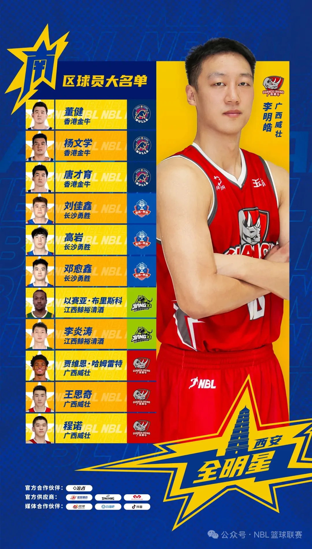 根据联盟规则,南区首发空缺由票选结果顺位递补。此前在南区前场票选中排名第二的广西威壮球员李明皓将担任南区队长,率领全明星阵容出战;后场空缺则由长沙勇胜队后卫邓愈鑫(南区后场票选第三)递补进入首发。此外,广西威壮队球员程诺将填补庞峥麟留下的12人名单席位,首次入选全明星正赛。