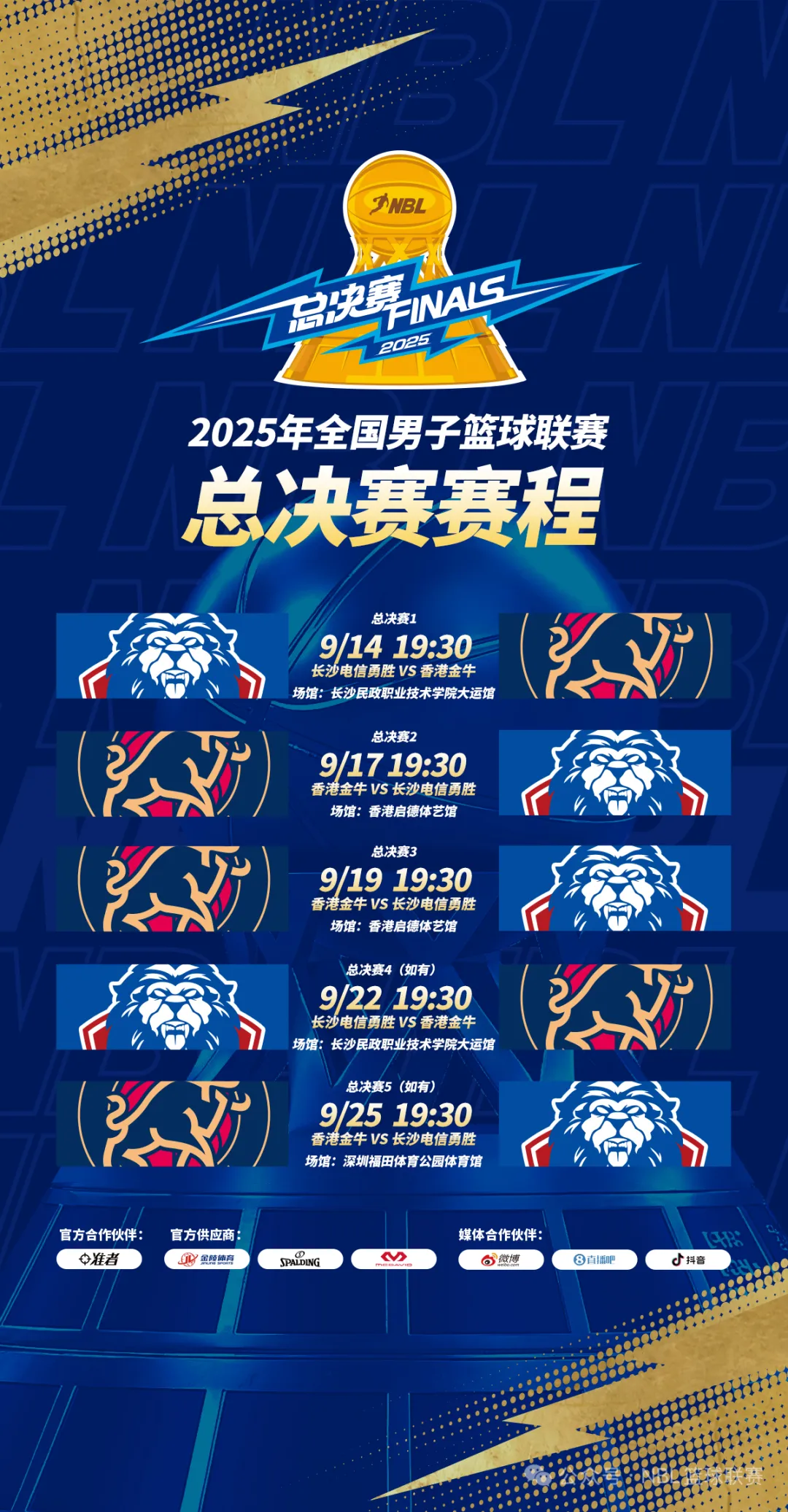 本赛季的总决赛赛程已经确定,将采用1-2-1-1的主场安排。首战将于9月14日晚在长沙拉开战幕,随后两场较量将移师香港启德体艺馆进行。整个系列赛最迟将于9月25日结束,届时将诞生2025赛季NBL的总冠军。