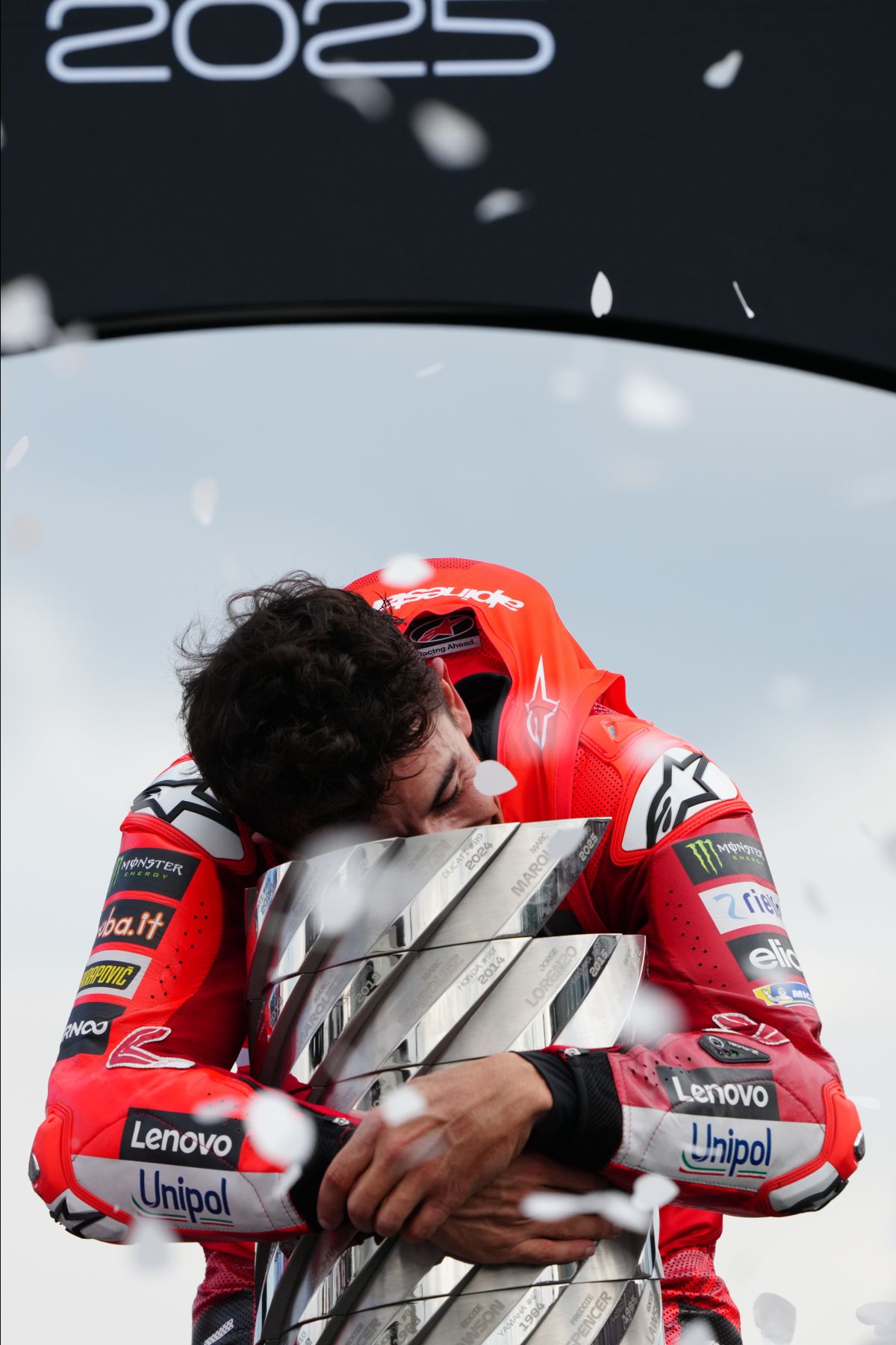 马奎斯冲线后,现场立即响起欢呼声。这位32岁的西班牙车手在赛道上举起双臂庆祝,五年前他在赫雷斯赛道遭遇严重手臂骨折,一度濒临退役,如今却以第七座MotoGP冠军奖杯重返巅峰。“这五年太艰难了,无数次康复训练时我都怀疑自己能否回到赛场,”马奎斯动情地说,“这个冠军属于所有支持我的人,也证明了坚持的意义。”最终,他以42分13秒508的成绩完赛,积分榜领先优势扩大至201分,远超锁定冠军所需的185分,提前五站终结悬念。