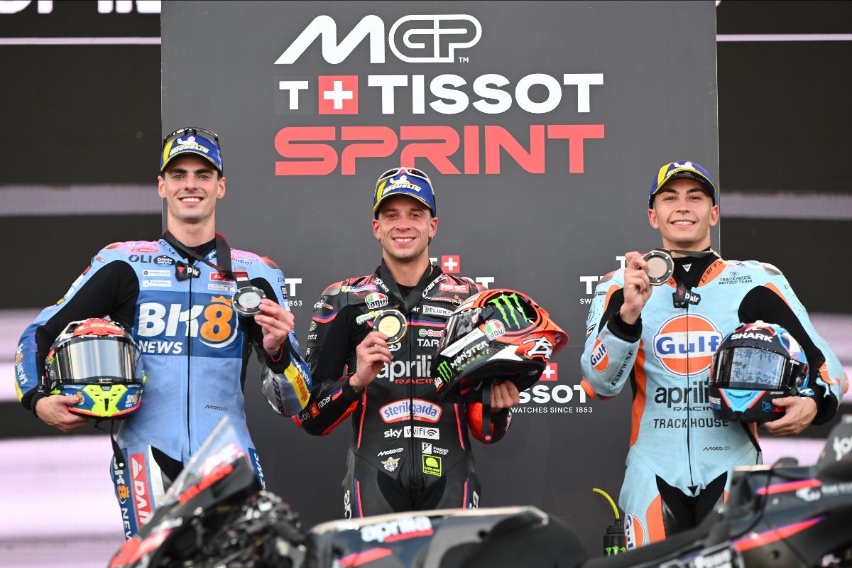 2025年10月4日,印尼曼达利卡赛道MotoGP印尼站冲刺赛上演本赛季最扣人心弦的逆转好戏。阿普利亚车队车手马尔科・贝泽奇在杆位起步遭遇“噩梦开局”、首圈跌至第八的绝境下,凭借冷静的战术调整与极致的圈速把控,于最后一圈10号弯绝杀BK8格雷西尼车队新秀费尔明・阿尔德盖尔,以0.157秒的微弱优势夺冠。Trackhouse车队的劳尔・费尔南德斯收获季军,职业生涯首次登上MotoGP领奖台。