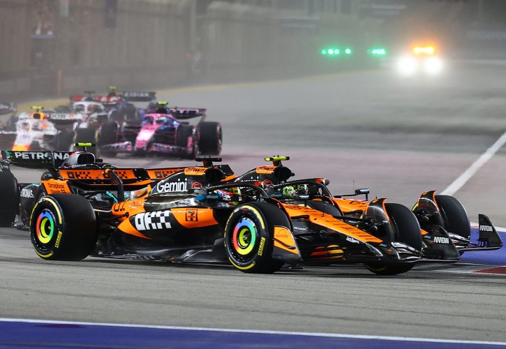 这场引发热议的碰撞发生在新加坡滨海湾赛道首圈3号弯。从第五位发车的诺里斯凭借出色的起步加速,迅速切入内线,试图同时挑战红牛车队的马克斯・维斯塔潘与队友皮亚斯特里。然而,湿滑的赛道条件(部分区域仍未完全干燥)与狭窄的弯道空间导致意外发生——诺里斯的赛车先轻微擦碰维斯塔潘的后轮,随后失去平衡,与相邻路线的皮亚斯特里发生二次碰撞。尽管两车均未严重受损,但皮亚斯特里的节奏被彻底打乱,名次从第三位滑落至第四,且全程未能找回赶超机会。