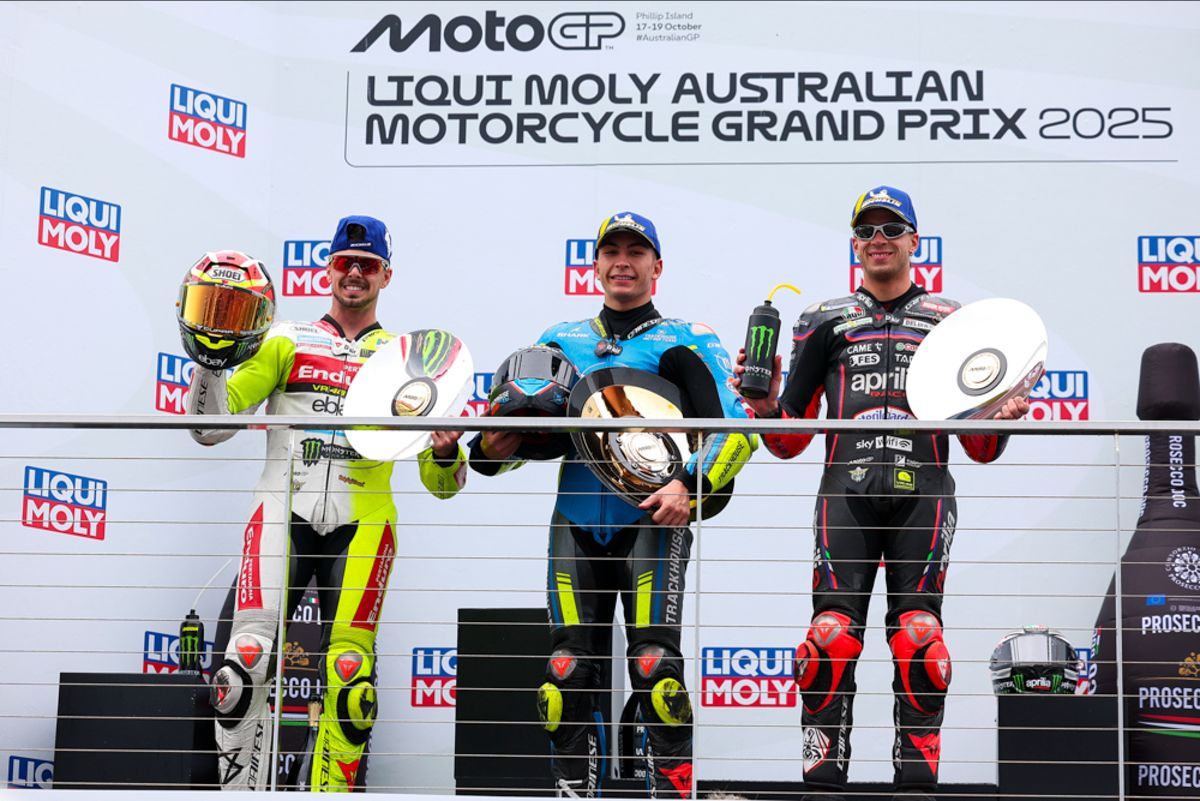 2025年10月19日,MotoGP澳大利亚大奖赛在菲利普岛赛道落下帷幕。西班牙车手劳尔・费尔南德斯以无可挑剔的统治级表现,斩获个人职业生涯首个MotoGP分站冠军,同时为Trackhouse MotoGP Team车队拿下队史首胜,至此围场所有车队均已在MotoGP大奖赛中品尝过冠军滋味。佩尔塔米纳耐力VR46车队的法比奥・迪・詹纳托尼奥从第10位发车一路逆袭摘得亚军,与冠军差距1.4秒;阿普利亚车队的马可・贝泽奇即便背负双重长圈处罚,仍在比赛末段超越BK8格雷西尼车队的亚历克斯・马尔克斯跻身季军,上演了一场精彩的逆境翻盘。