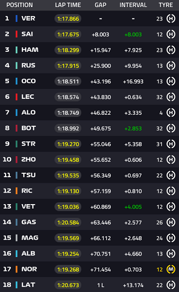 目前,排名第 1 的维斯塔潘与排名第 2 的塞恩斯之间拉开了超过 2 秒的差距。