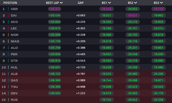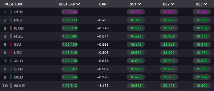 目前排名前六的成绩为:维斯塔潘 5.6 秒,赛恩斯 5.8 秒,阿隆索 5.9 秒,诺里斯 6.0 秒,斯托尔 6.1 秒。