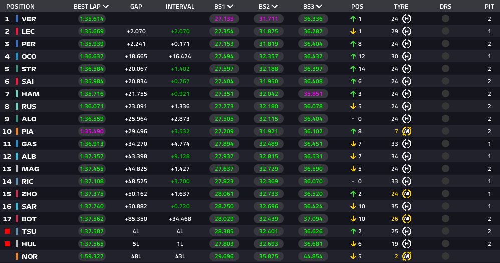 第 20 圈:领跑的前三甲排名为勒克莱尔,佩雷兹落后 13 秒位居第二,斯特罗尔再落后佩雷兹 6 秒排名第三。